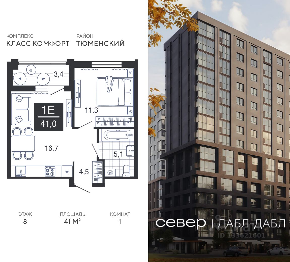 Продаётся квартира площадью 41 м2 в жилом комплексе ''Дабл-Дабл''. Квартира находится на 8 этаже, жилая площадь квартиры 11.3 м2, площадь просторной кухни — 16.7 м2. Среди особенностей планировки — изолированные комнаты с окнами на одну сторону, 1 совмещённый санузел.