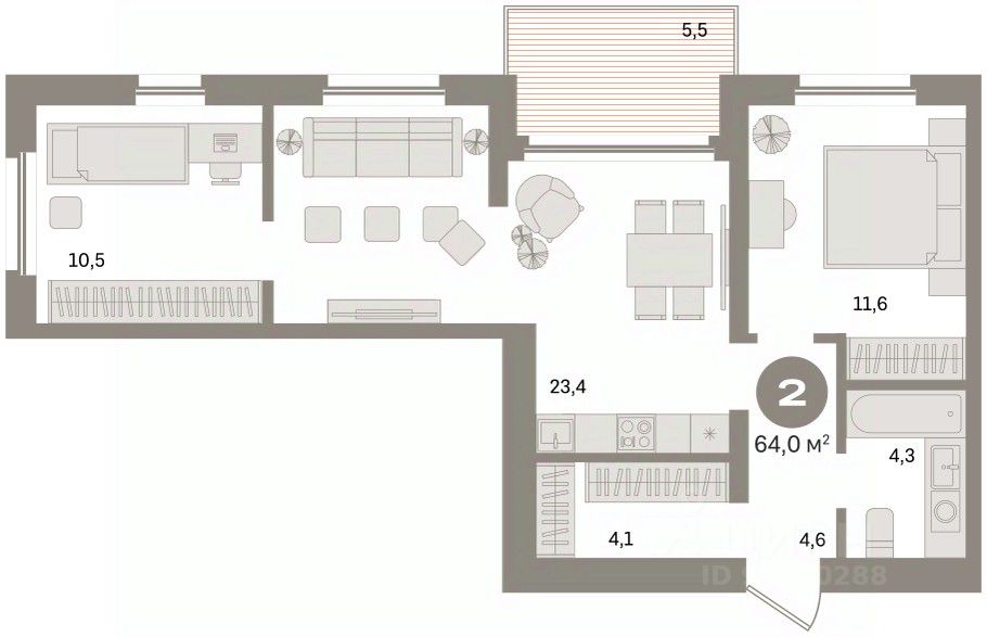 Квартира с кухней-гостиной и двумя спальнями в Южных кварталах. Особенности планировки: балкон, предчистовая отделка, разнесённые спальни. квартиры в нашей базе: ЮК04-А1-9-9.16.3.