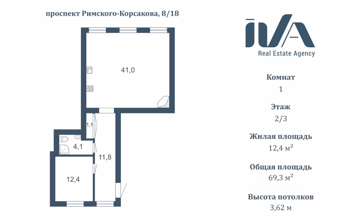 Площадь общая: 69.3 м2 Площадь жилая: 12,4 м2 Площадь кухни-гостиной: 41 м2 Высота потолков: 3.62 м