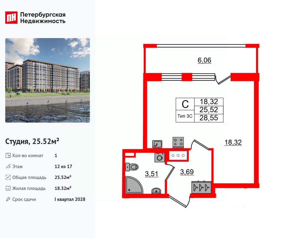 Удобная, классическая, функциональная европланировка, просторная прихожая 3.69 м². Общая площадь студии - 25.52 м², жилая 18.32 м², высота потолка 2.77 м.