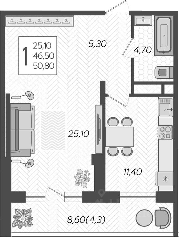 Общая площадь50,8 м2
