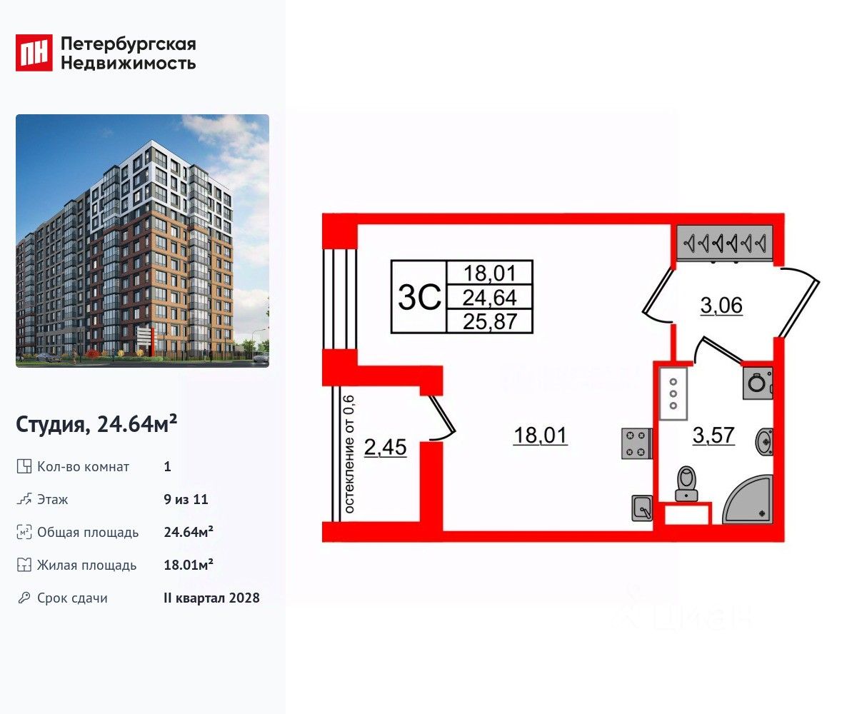 Удобная, классическая, функциональная европланировка, вместительная прихожая 3.06 м². Общая площадь студии - 24.64 м², жилая 18.01 м², высота потолка 2.77 м.