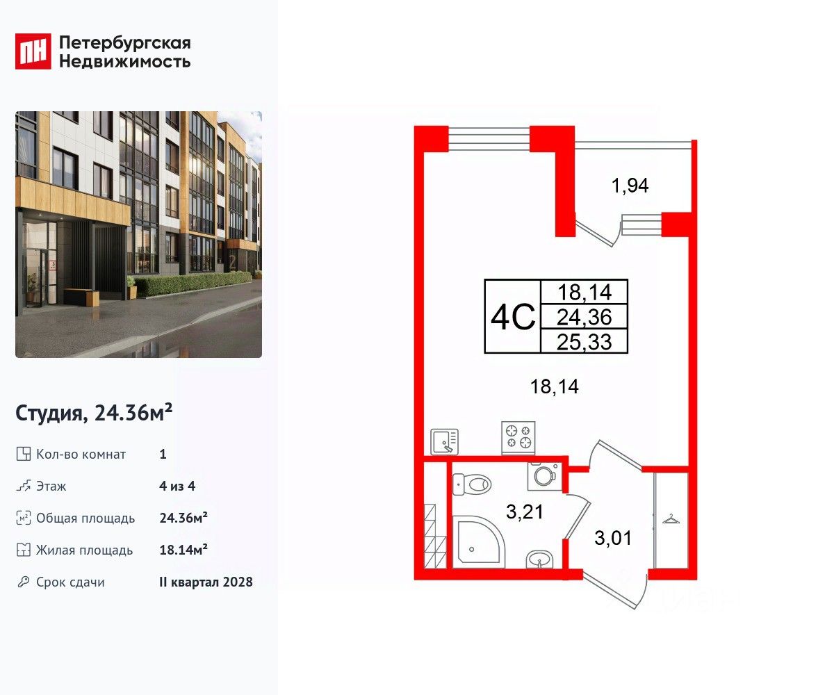 Удобная, классическая, функциональная европланировка, вместительная прихожая 3.01 м². Общая площадь студии - 24.36 м², жилая 18.14 м², высота потолка 3.07 м.