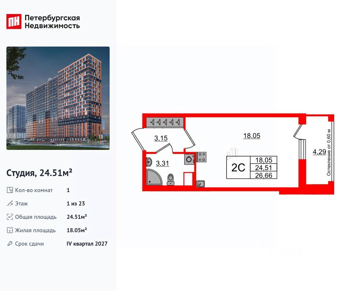 Удобная, классическая, функциональная европланировка, вместительная прихожая 3.15 м². Общая площадь студии - 24.51 м², жилая 18.05 м², высота потолка 2.77 м.