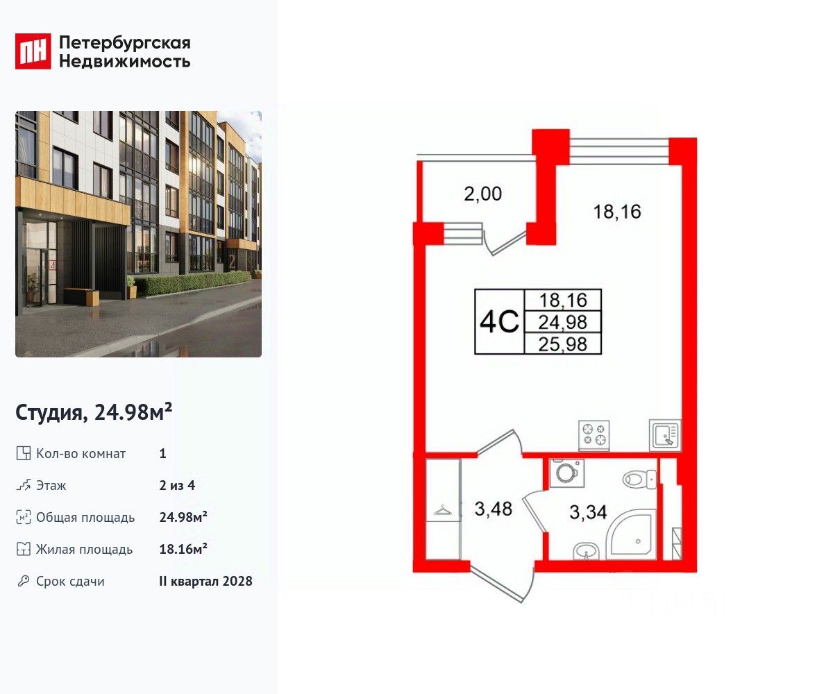 Удобная, классическая, функциональная европланировка, вместительная прихожая 3.08 м². Общая площадь студии - 24.98 м², жилая 18.16 м², высота потолка 2.77 м.