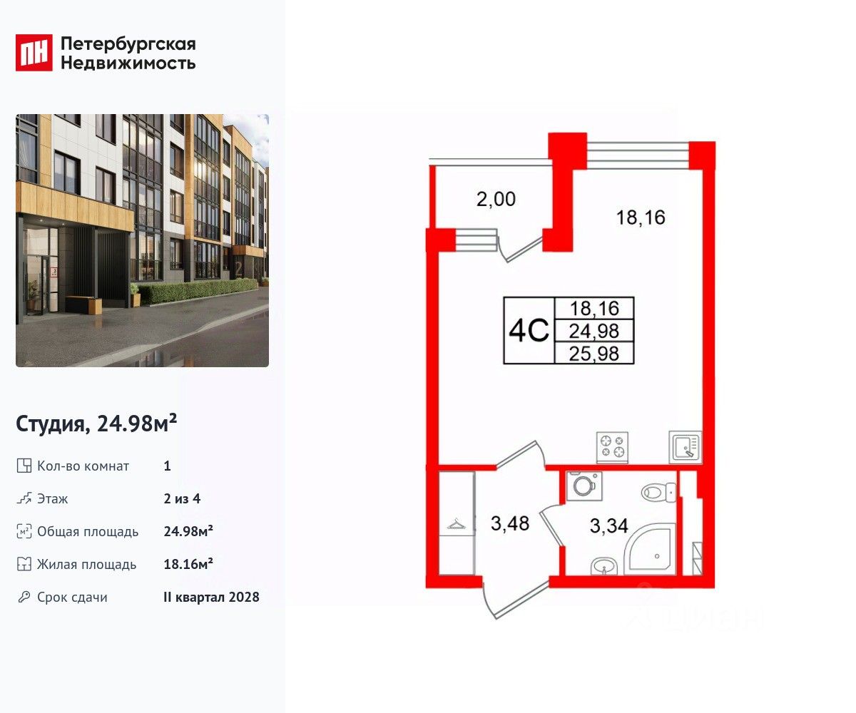 Удобная, классическая, функциональная европланировка, вместительная прихожая 3.08 м². Общая площадь студии - 24.98 м², жилая 18.16 м², высота потолка 2.77 м.