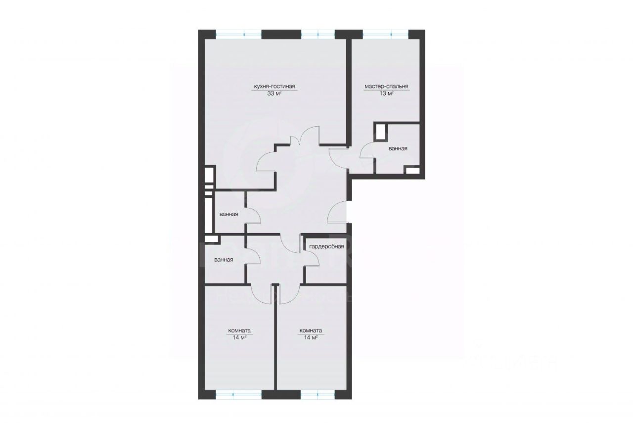 Общая площадь 102 кв.м, включающая в себя помимо жилых пространств гардеробную комнату, три санузла и вместительную прихожую.