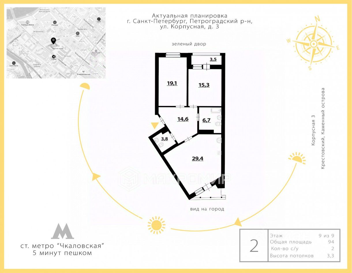 Арт. 127834451 Предлагается уникальная квартира в ЖК ''Мендельсон'' в престижном Петроградском районе на ул. Корпусная, д. 3. Квартира европланировки с 2-мя спальнями и просторной кухней-гостиной с панорамным видом на достопримечательности Санкт-Петербурга. Квартира расположена на верхнем 9-м эт. с высокими потолками 3,3 м, с индивидуальной вентиляционной шахтой. Кухня-гостиная имеет выход на террасу с открывающимися видами на Ленинградскую Телебашню, шпиль и купол Петропавловского собора, зелень Каменного и Крестовского островов, вид из спален в благоустроенный двор, одна спальня имеет лоджию со стеклопакетами LUMON.