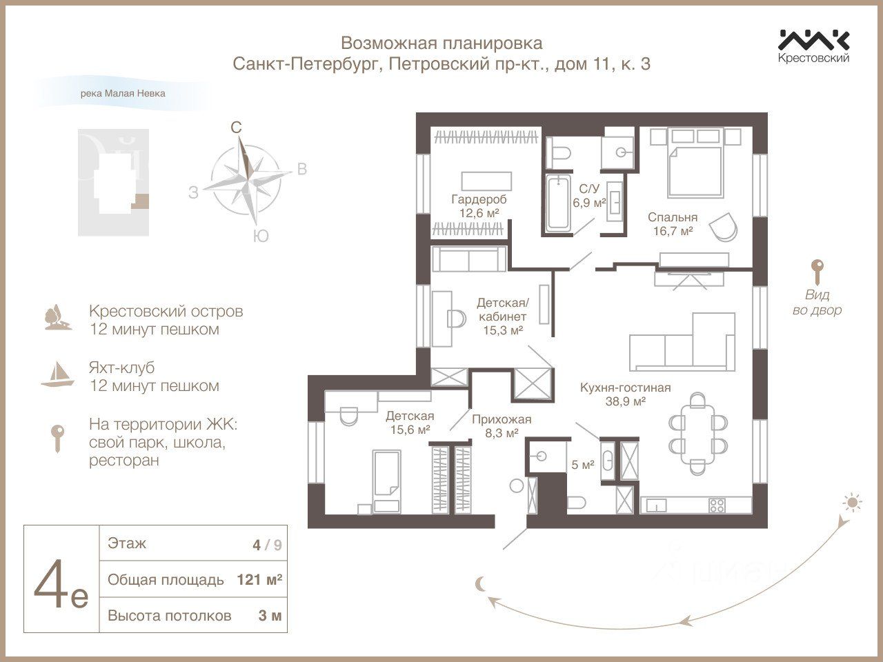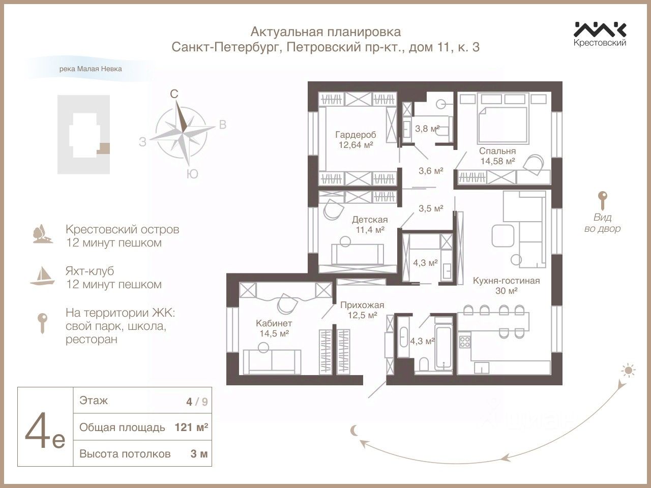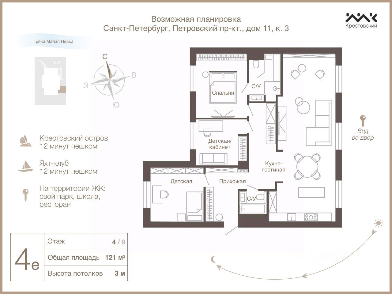О локации: Петровский остров сегодня - это одна из самых престижных локаций Петербурга, где сочетаются уединенность и близость исторического центра. Непревзойденный стиль в каждой детали. Максимально однородный социальный статус жителей. Комплекс расположен в самой зеленой части Петровского острова, имеет собственную прогулочную набережную. До метро Крестовский остров идти 15 минут. До центра города вы доберетесь за 15 минут на автомобиле, а до ЗСД ехать 7 минут. В пешей доступности несколько детских садов, в округе множество престижных школ.
