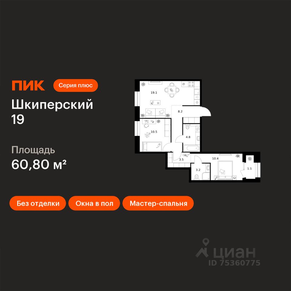 Продаётся 2-комн. квартира площадью 60,8 кв.м на 3 этаже 8 этажного дома (Корпус 2, Секция 3) проекта ПИК Шкиперский 19. Светлый просторный подъезд на уровне земли, функциональная планировка, большие окна, без отделки.