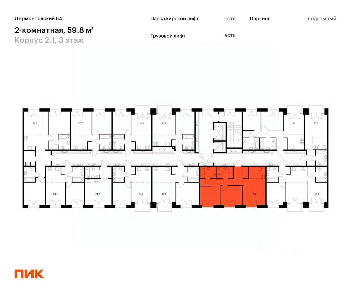 Продаётся 2-комн. квартира площадью 59,8 кв.м на 3 этаже 9 этажного дома (Корпус 2.1, Секция 6) проекта ПИК Лермонтовский 54. Светлый просторный подъезд на уровне земли, функциональная планировка, большие окна, без отделки.