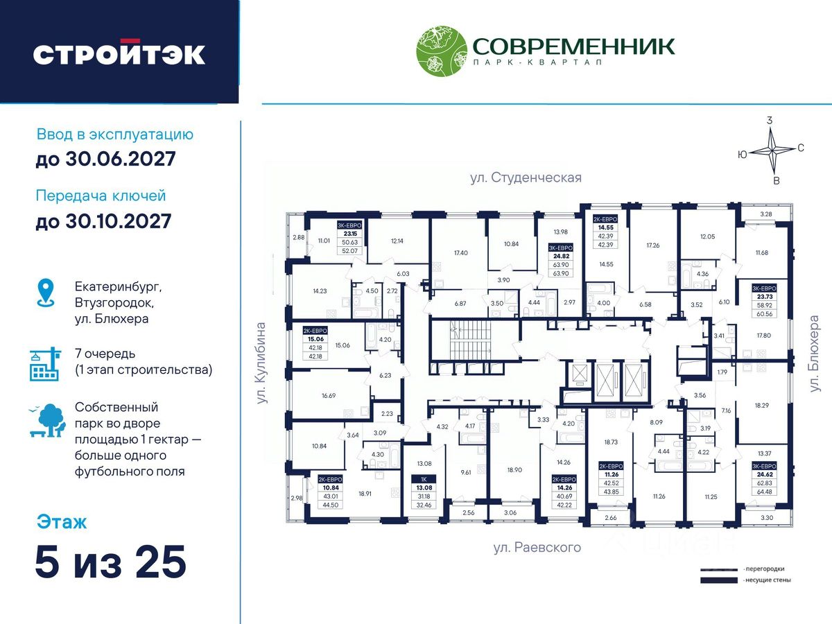 Время жить счастливо Современник — знаковый парк-квартал в интеллигентном районе Втузгородок, откуда недалеко до центра, а вблизи ведущие вузы и театры. Квартал состоит из 8 очередей строительства. Шесть очередей уже сданы и заселены, седьмая строится. В продаже квартиры от застройщика: 1 этап седьмой очереди. Объединяет квартал большой внутренний парк площадью в гектар — богатый прогулочными маршрутами, тенистыми деревьями, пространствами для отдыха, спорта и детских игр. С внешней стороны, у домов седьмой очереди, появится гостевой центр. Проект создавали в KCAP Architects and Planners, архитектурном бюро из Нидерландов, чьи работы украшают ландшафты Гамбурга, Антверпена и других городов Европы. Технологии, продуманное пространство и трендовый облик зданий создают размеренную атмосферу для жизни здесь. Достойное окружение До проспекта Ленина на машине вы доберётесь за 10 минут, а с другой стороны, неподалёку — Шарташский лесопарк с озером Шарташ, которому около миллиона лет. Здесь для вас пляжи, лодочные станции, тропы для бега и кафе. В квартале уже работают супермаркеты, пекарни, салон красоты и не только. Ближние школы, гимназии и университеты помогут расправить крылья новым поколениям, а детские сады станут заботливой средой в начале пути. Кстати, на территории квартала спроектирован муниципальный детский сад на 200 мест. Выходите во двор Гуляйте по зелёным аллеям или устройтесь с книгой в гамаке. Займитесь воркаутом, футболом, баскетболом или пинг-понгом. Проводите семейные праздники под крытым амфитеатром или отправьте детей играть на насыщенный плейхаб. Мы всё предусмотрели. На закрытой территории без машин и посторонних спокойно и безопасно. Видеонаблюдение и освещение добавляют ещё больше уверенности. Впечатляющая доминанта у домов 7 очереди — новый гостевой центр: камерное пространство под навесом-перголой с озеленением и скамейками, чтобы встречать друзей. Ваша зона комфорта Стильное лобби Современника мы выполним в эстетике contemporary: минимализм, сочетание дерева со штукатуркой и тёмным металлом, зеркала, витражи. Обстановка из мягкой мебели, растений и книг. Двери из холла выходят на обе стороны. Внутри — комната для колясок и самокатов. На -1 этаже подземный паркинг с 201 машино-местом, куда легко попасть на лифте прямо с вашего этажа. Здесь же можно приобрести одну из 67 кладовых, чтобы хранить сезонный инвентарь. СТРОЙТЭК возводит 7 очередь в 3 этапа. Дом с привилегиями Первый этап — секция 7.1, башня в 25 этажей. Здесь 246 квартир в 19 уникальных планировках от студий до 3-комнатных, в классических и евро-вариантах. Просторные кухни-гостиные, гардеробные и окна на 2 стороны — лишь часть их плюсов. В Современнике улучшенный стандарт отделки ''Комфорт +''. Помимо комфортных сантехники и электрики, в него входят оконные стёкла Energy Light, которые помогают сохранять температуру, прочный ламинат 33 класса и устойчивые к многократной покраске виниловые обои. Белые межкомнатные двери и плинтусы подчеркнут любую цветовую гамму.