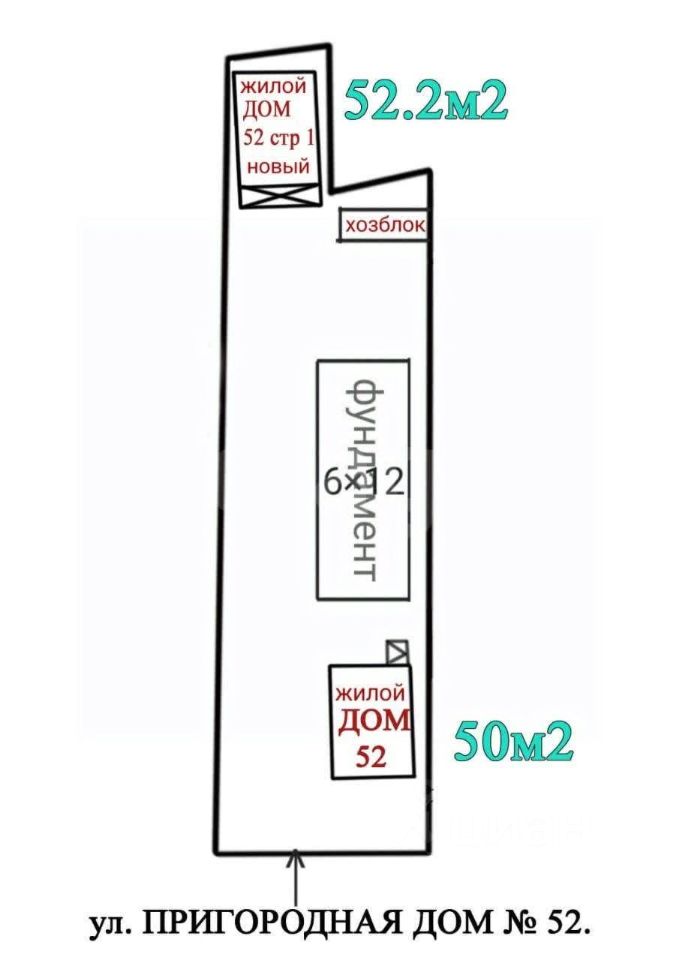 ** Об объекте:** • Участок 7 соток правильной формы на центральной улице • Два жилых дома (50 м² и 52 м²) + хозблок 10 м² • Основной дом 2014 г. (2 этажа, брус с утеплением, 4+ комнаты) • Готовый монолитный фундамент 72 м² (612 м) под строительство нового дома • Все строения зарегистрированы (проверка по кадастру) • Участок выровнен, поднят песком, ограждение из профнастила