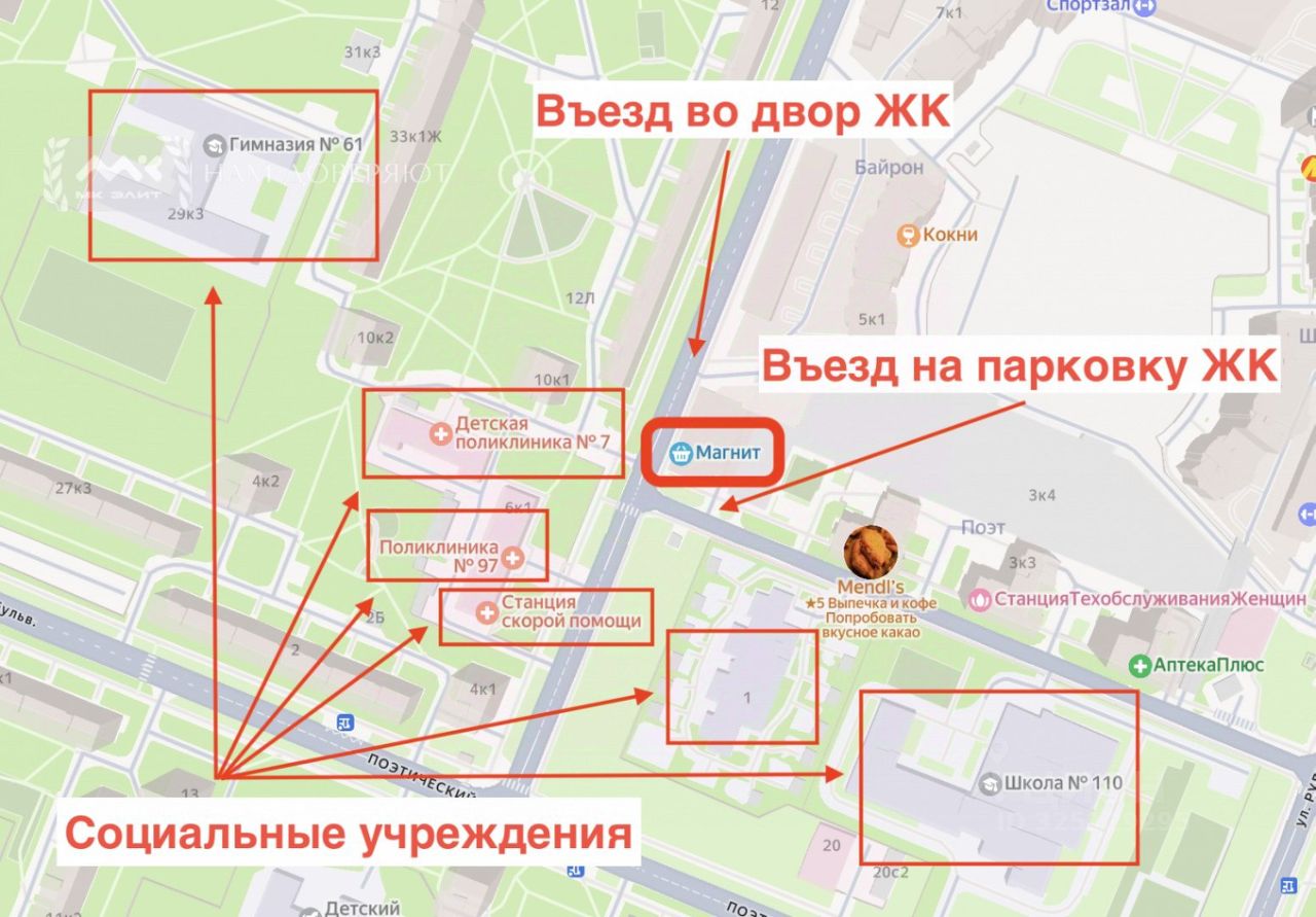 В радиусе 150 м расположены: 2 общеобразовательные школы, Детский сад, Поликлиника, Отделение скорой помощи.