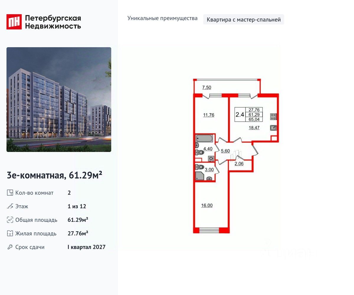 Уникальная, функциональная европланировка, большая кухня-гостиная 18.47 м², вместительная прихожая 5.6 м². Общая площадь квартиры - 61.29 м², жилая 27.76 м², высота потолка 2.77 м.