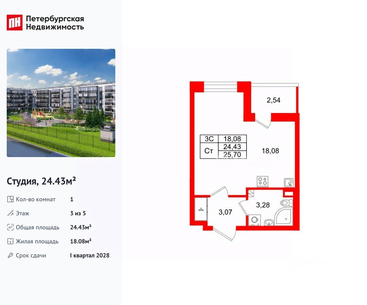 Удобная, классическая, функциональная европланировка, вместительная прихожая 3.07 м². Общая площадь студии - 24.43 м², жилая 18.08 м², высота потолка 2.77 м.