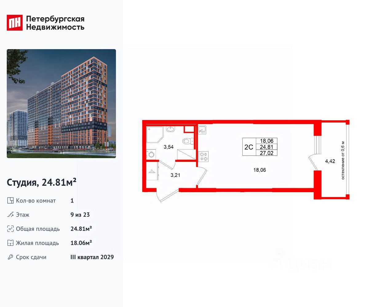 Удобная, классическая, функциональная европланировка, вместительная прихожая 3.21 м². Общая площадь студии - 24.81 м², жилая 18.06 м², высота потолка 2.77 м.