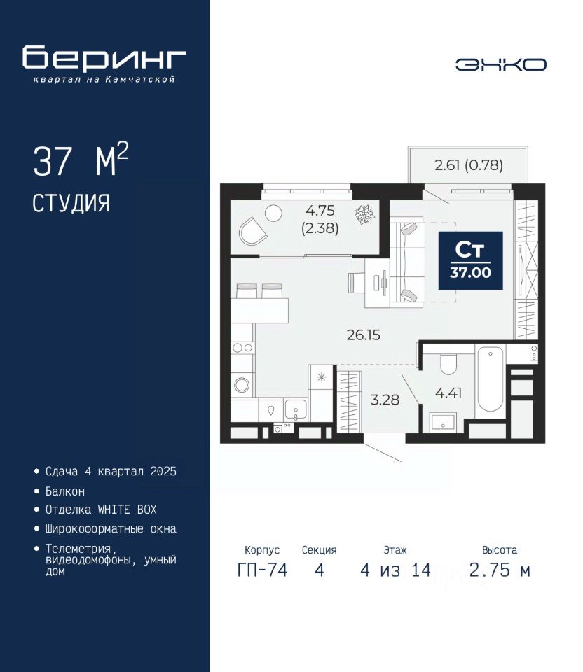 Продается 1-комн. квартира-студия с предчистовой отделкой в ЖК ''Беринг'' на 4 этаже. Общая площадь: 37 кв.м., площадь гостиной 26.15 кв.м., из которых 5 кв.м. выделено под кухонную зону. Все окна выходят на одну сторону. В квартире один балкон, один совмещенный санузел. Высота потолков 2.75 м.