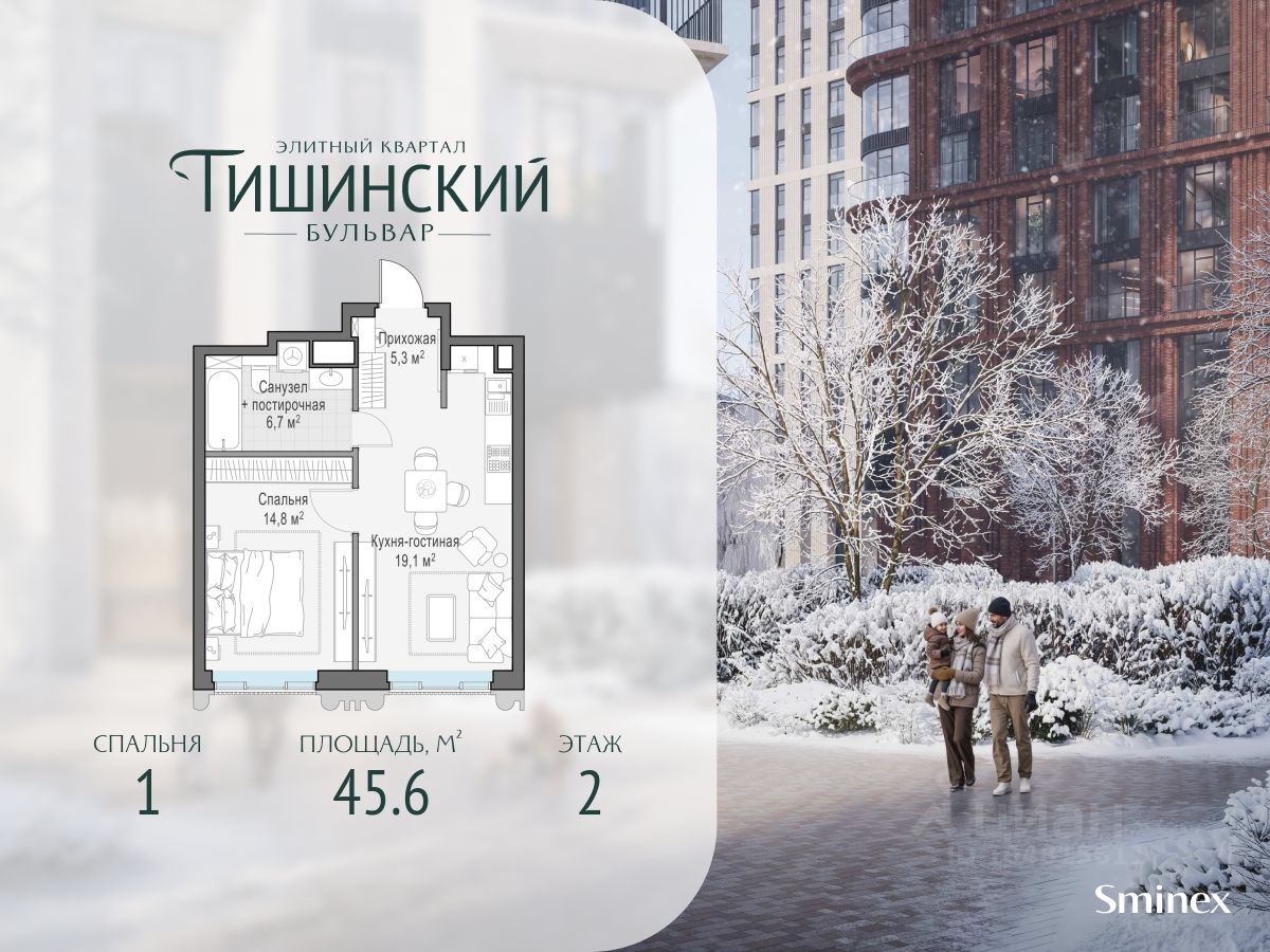 В продаже 1-комнатная квартира квартира в элитном квартале ''Тишинский бульвар''. Общая площадь квартиры - 45.60 кв.м. Этаж 2 из 14. Корпус К4С1.