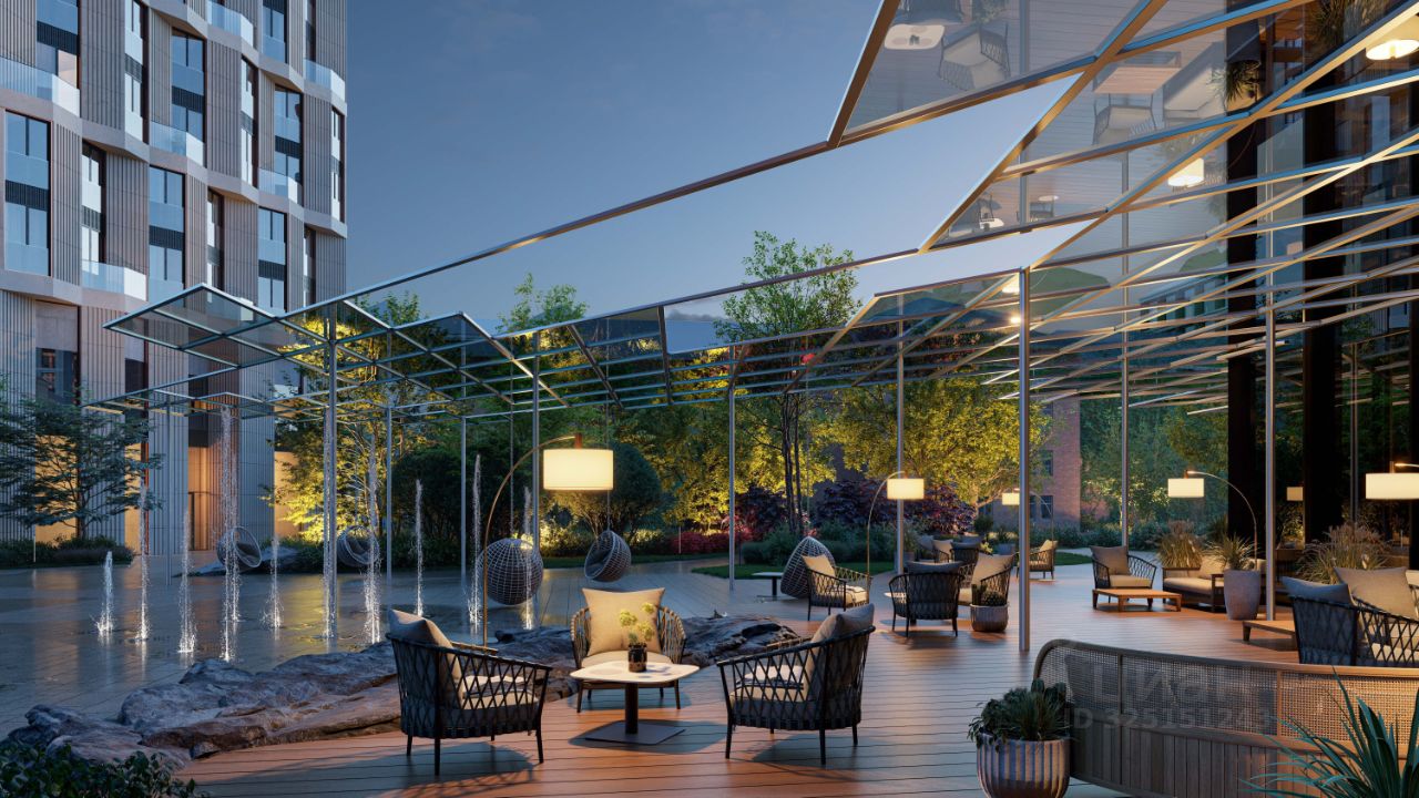 В парке созданы крытые галереи и приватные зелёные комнаты для отдыха и медитаций в любую погоду. Насыщенное озеленение многолетними растениями с разными периодами цветения сохраняет территорию квартала красивой круглый год.