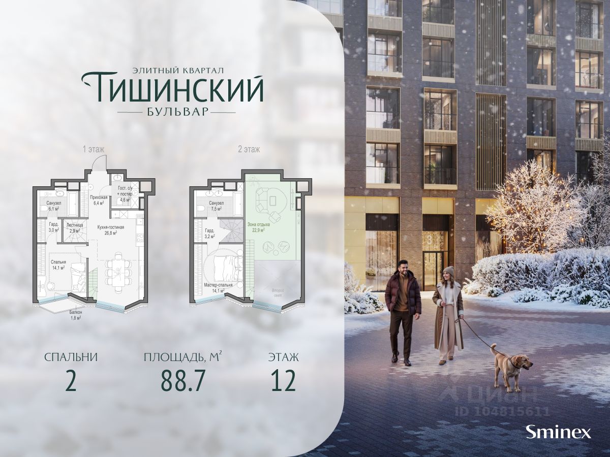 В продаже 2-комнатная квартира квартира в элитном квартале ''Тишинский бульвар''. Общая площадь квартиры - 88.70 кв.м. Этаж 12 из 14. Корпус К6.