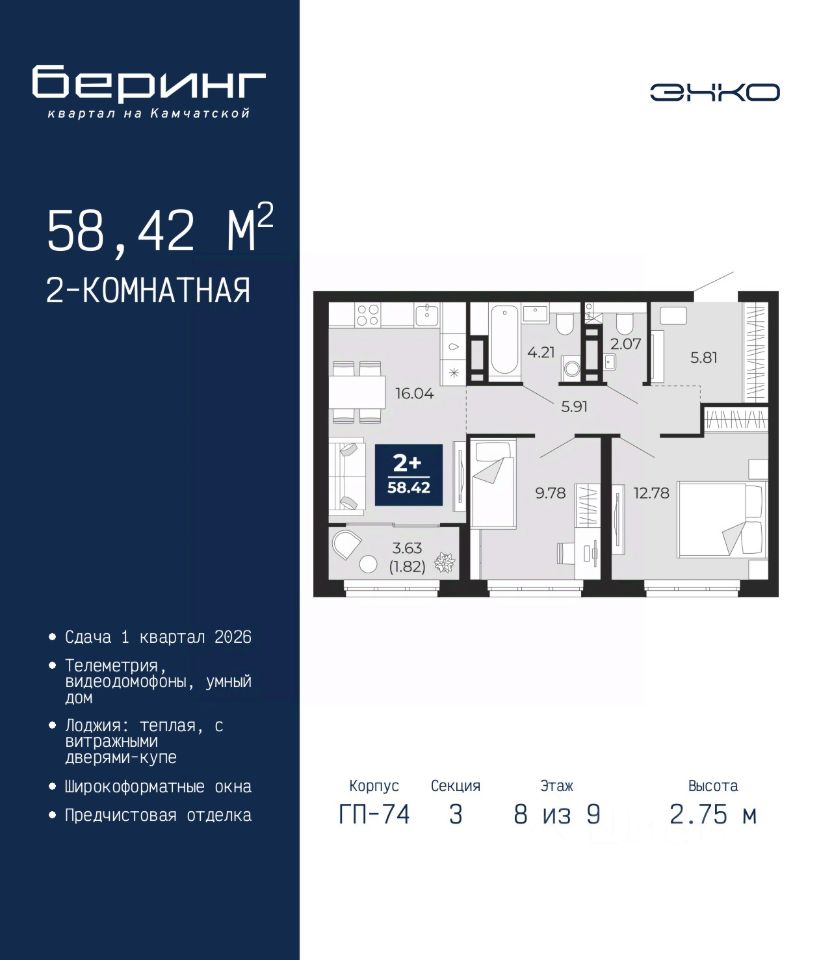 2-комн. квартира с предчистовой отделкой в ЖК ''Беринг'' на 8 этаже. Общая площадь: 58.42 кв.м., жилая: 22.56 кв.м., площадь просторной кухни-столовой: 16.04 кв.м. Комнаты изолированные, все окна выходят на одну сторону. В квартире одна лоджия, один совмещенный и один раздельный санузел. Высота потолков 2.75 м.