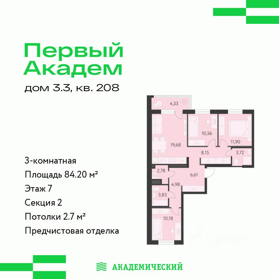 Продается 3-комнатная квартира площадью 84.2 кв.м. от девелопера ''Академический'' в жилом квартале ''Первый Академ''. Срок сдачи дома в 2028 году. Выгоды и скидка напрямую от застройщика.