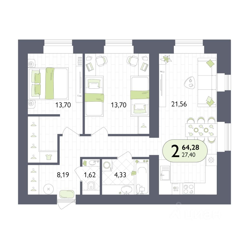 Общая площадь64,28 м2