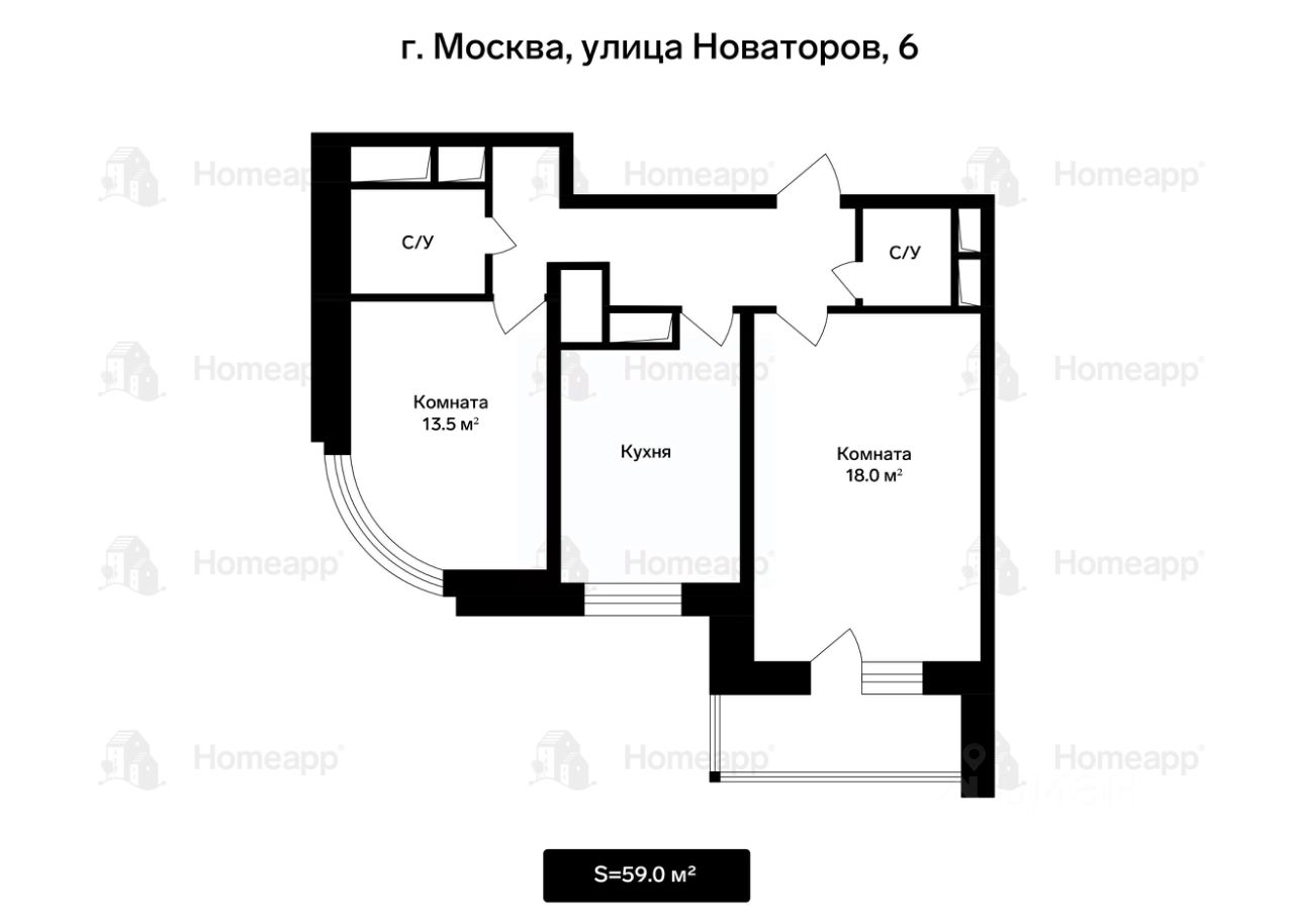 О квартире: Планировка: Общая площадь 58,9 кв. м. Две изолированные жилые комнаты (18.0 м² и 13.5 м²).