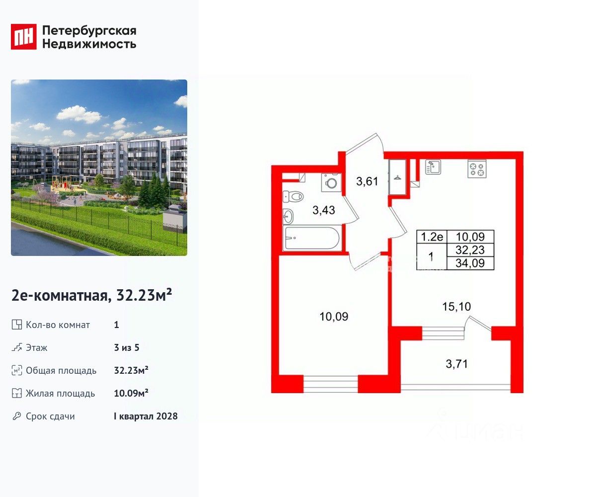 Удобная, классическая, функциональная европланировка, большая кухня-гостиная 15.1 м², вместительная прихожая 3.61 м². Общая площадь квартиры - 32.23 м², жилая 10.09 м², высота потолка 2.77 м.