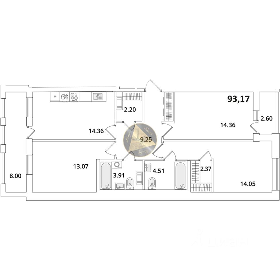 О квартире: - Квартира находится на 10 этаже 18-этажного дома - Общая площадь квартиры 93.17 м2 - Мастер-спальня 14.05 м2 с отдельным санузлом 4.51 м2 и гардеробной 2.37 м2 - Детские комнаты 13.07 и 14.36 м2 - Кухня-гостиная 14.36 м2 - Совмещённый санузел 3.91 м2 - Гардеробная 2.20 м2 - 2 застекленные лоджии 2.60 и 8.00 м2