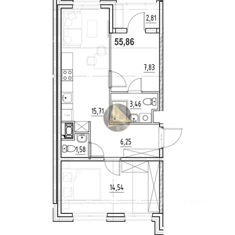 Квартира находится на 4/13 этаже. Общая площадь квартиры 55.86 м2. Светлая спальня 7.83 м2 с отдельным санузлом 3.46 м2. Детская комната 14.54 м2 с гардеробной. Просторная кухня-гостиная 15.71 м2. Гостевой санузел 1.58 м2. Лоджия 2.81 м2.