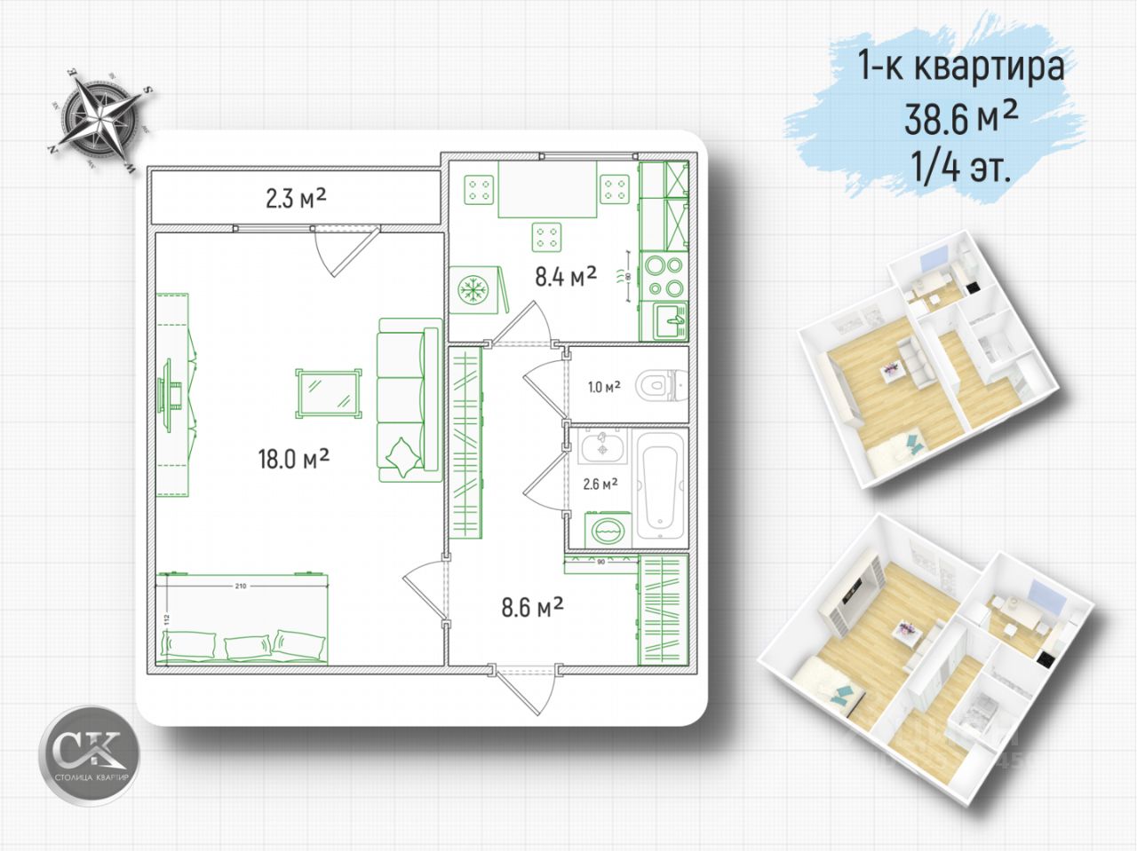 Общая площадь: 38.6 м² | Жилая: 18 м² | Кухня: 8.4 м² Этаж: 1 высокий этаж из 4 | Тип дома: панельный, серия ЛГ-600 (ДСК-3)