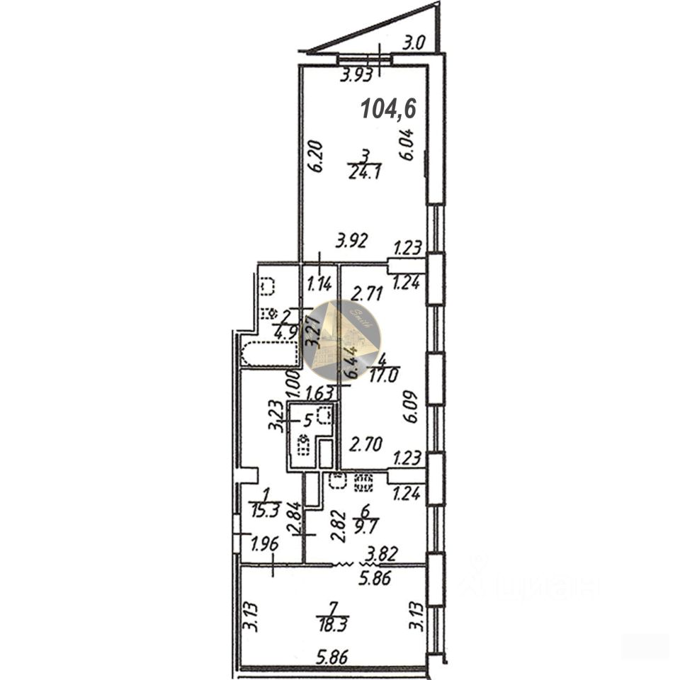 О квартире: - Квартира находится на 6 этаже 25-этажного дома - Общая площадь квартиры 104.6 м2 - Уединённая спальня 24.1 м2 - Детские комнаты 17.0 и 18.3 м2 - Светлая кухня 9.7 м2 - Раздельный санузел 4.9 + 2.3 м2 - Терраса 3.0 м2