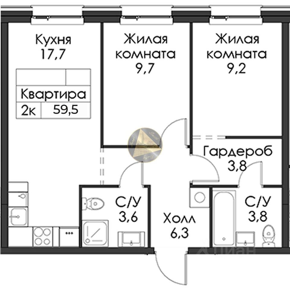 О квартире: - Квартира находится на 8 этаже 12-этажного дома - Общая площадь квартиры 59.5 м2 - Мастер спальня 9.2 м2 с гардеробной 3.8 м2 и отдельным санузлом 3.8 м2 - Уютная детская 9.7 м2 - Просторная кухня-гостиная 17.7 м2 - Совмещённый санузел 3.6 м2