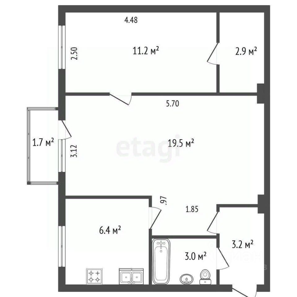 2 комнаты: 1 - 19,5 м2 2 - 11,2 м2 Кухня - 6,4м2 Выход на балкон из комнаты Санузел совмещен