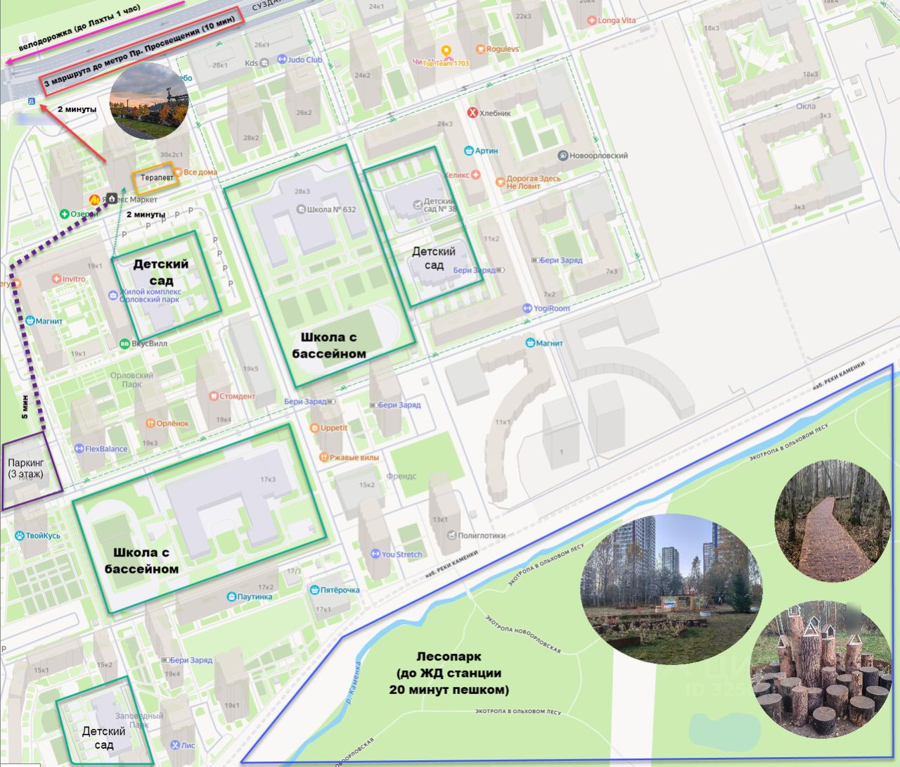 Отличная локация вдали от городской суеты, вокруг лес, включающий в себя Новоорловский заказник с экотропами.