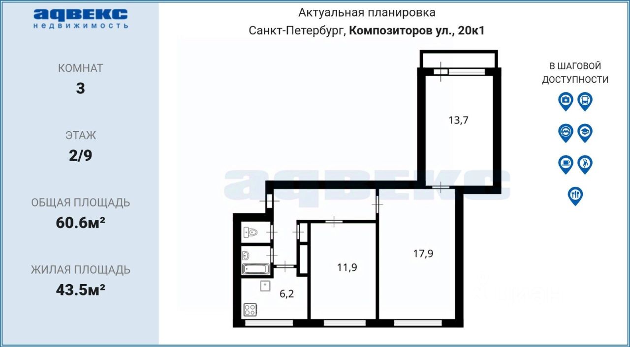 До метро ''Проспект Просвещения'' 16 минут пешком. В пешей доступности поликлиника, остановки, магазины, множество школ и детских садов. Рядом Шуваловский парк и Суздальские озёра.