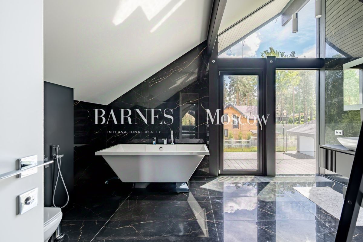 Дом: Новый дом 2022 года постройки, образцовый Фарферх с панорамной окнами в стороне спален и гостиной, смотрящих на лужайку участка и внешней отделкой со стороны подъезда к дому.