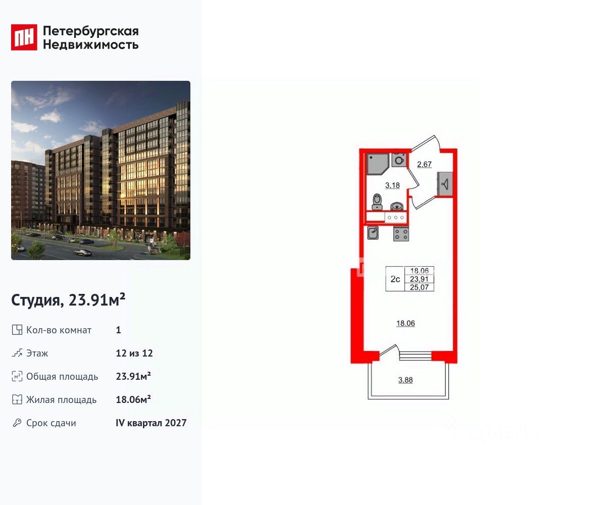Удобная, классическая, функциональная европланировка, вместительная прихожая 2.67 м². Общая площадь студии - 23.91 м², жилая 18.06 м², высота потолка 3 м.