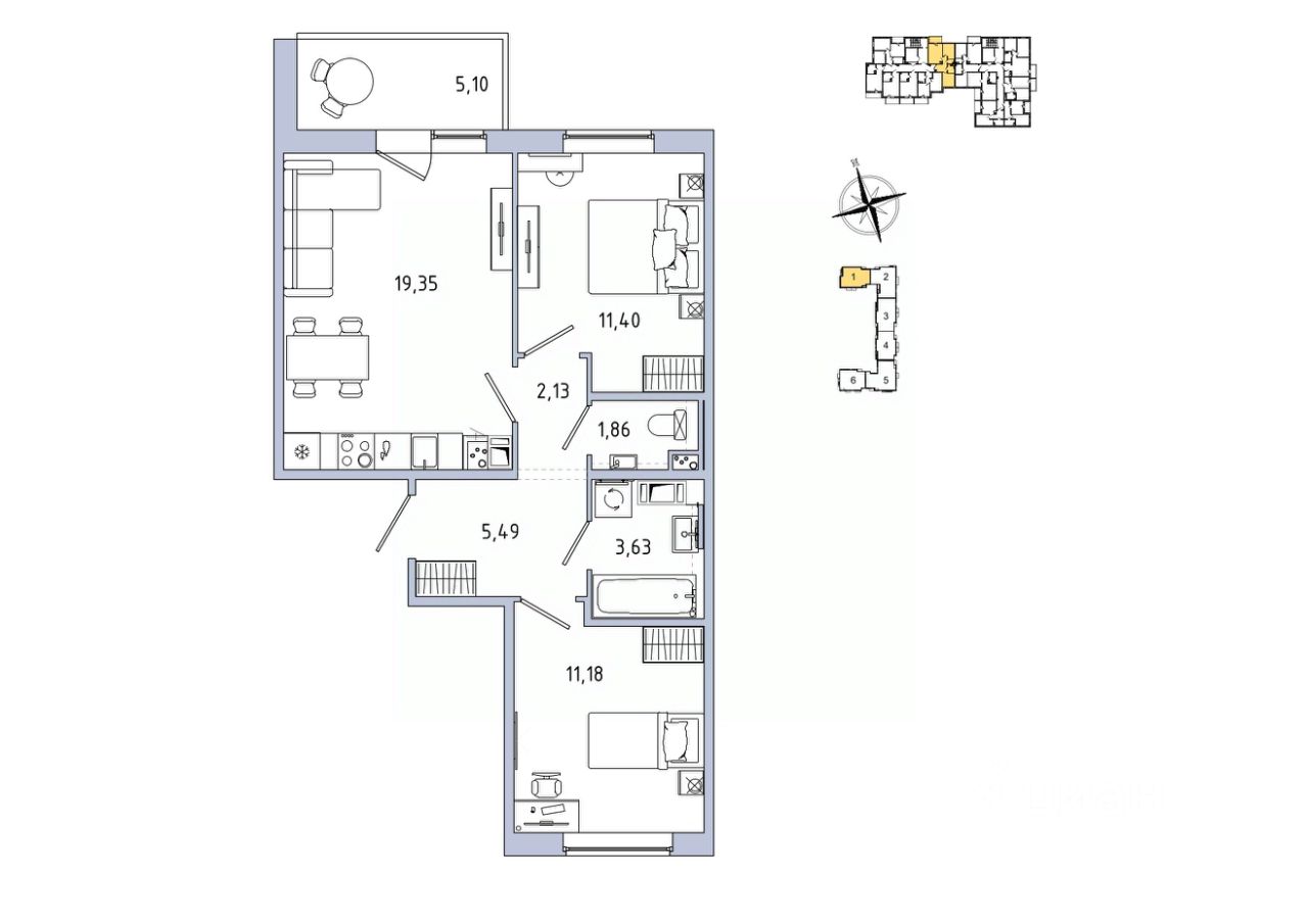 Общая площадь57,59 м2
