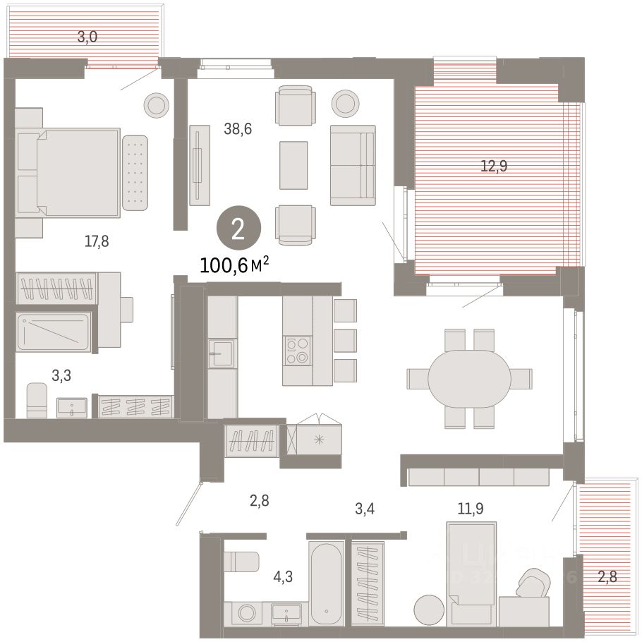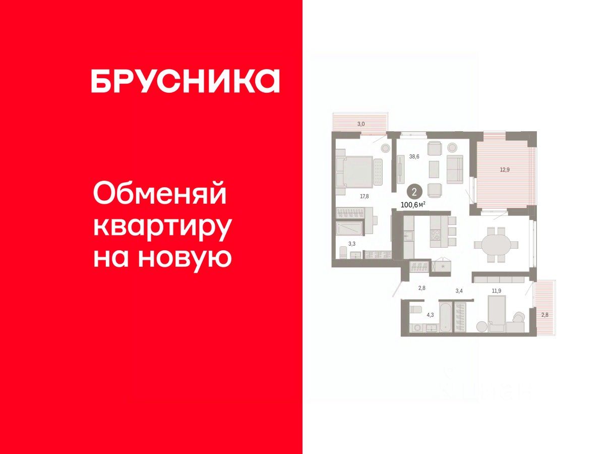 2-комн. квартира с предчистовой отделкой в ЖК ''Республики 205'' на 5 этаже. Общая площадь: 100.64 кв.м. Высота потолков 2.7 м.