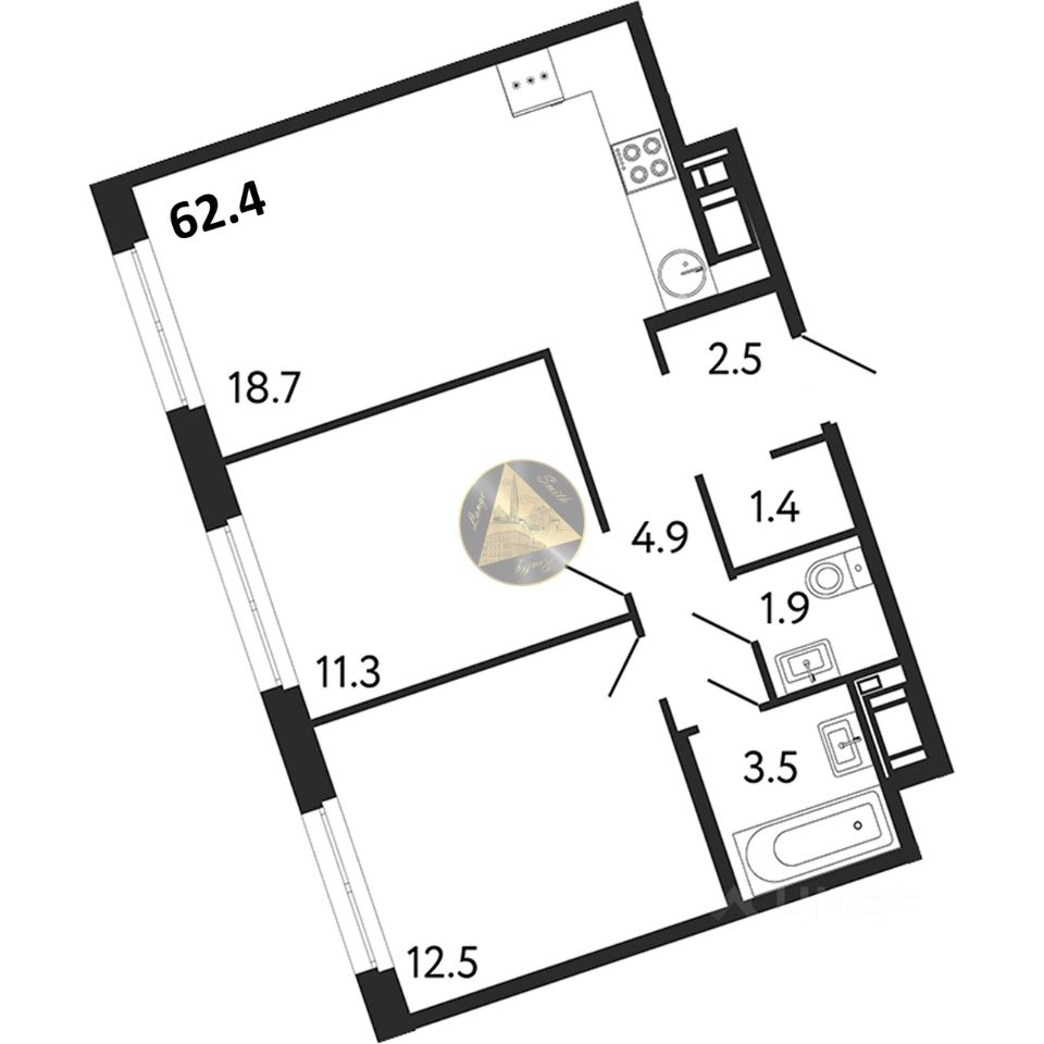 Квартира находится на 7/8 этаже. Общая площадь квартиры 62.4 м2. Светлая спальня 12.5 м2. Детская комната 11.3 м2. Просторная кухня-гостиная 18.7 м2. Раздельный санузел 3.5 + 1.9 м2. Гардеробная 1.4 м2.