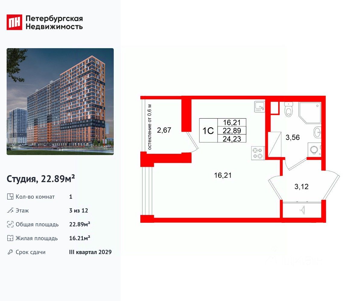 Удобная, классическая, функциональная европланировка, вместительная прихожая 3.12 м². Общая площадь студии - 22.89 м², жилая 16.21 м², высота потолка 2.77 м.