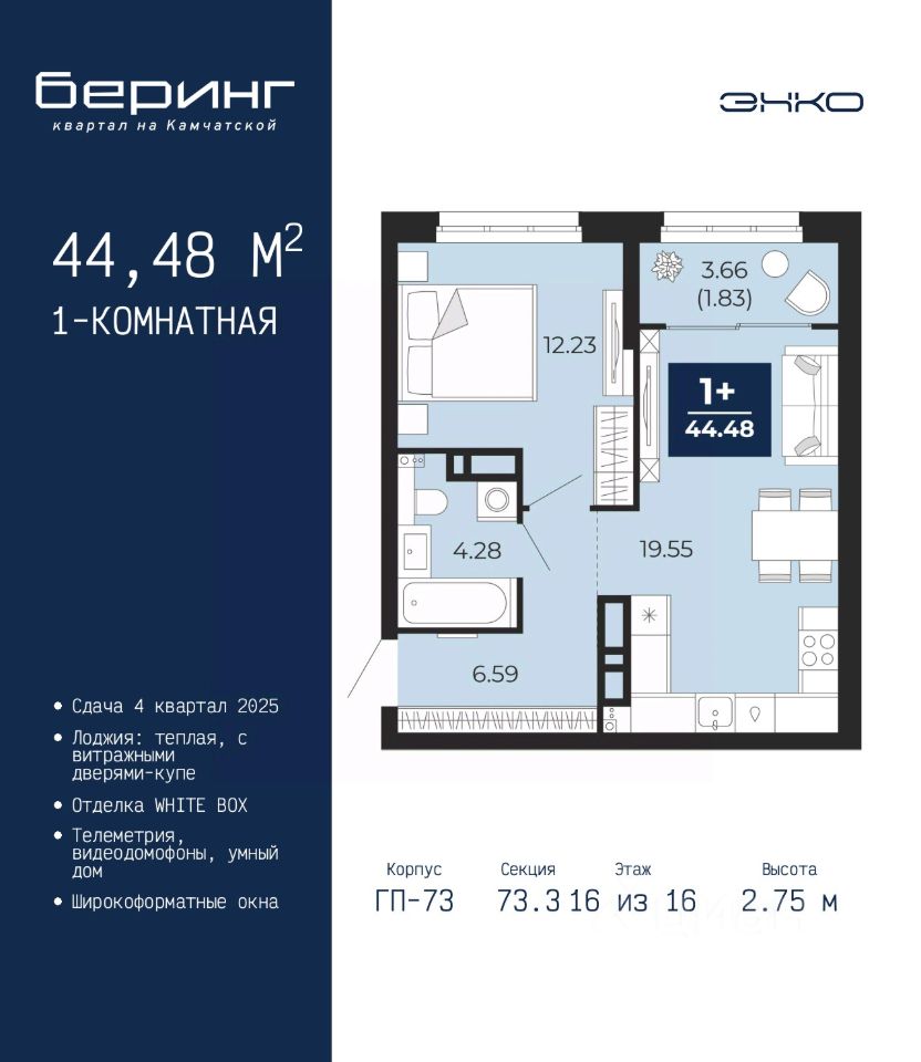 Просторная однокомнатная квартира с предчистовой отделкой в ЖК ''Беринг'' на 16 этаже. Общая площадь: 44.48 кв.м., жилая: 12.23 кв.м., площадь просторной кухни-столовой: 19.55 кв.м. Все окна выходят на одну сторону. В квартире одна лоджия, один совмещенный санузел. Высота потолков 2.75 м.