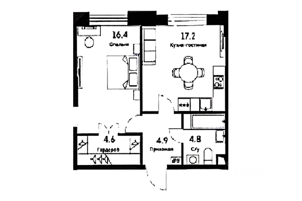 Планировка квартиры предусматривает - Просторная гостиная объединена с кухней, обеспечивая удобство пространства для семейных ужинов и приема гостей. - Спальная зона оборудована отдельным помещением, изолированным от основной части квартиры, создавая комфортные условия для отдыха. - Наличие функциональной гардеробной позволяет рационально организовать хранение вещей. - Санузел оснащен необходимым инженерными коммуникациями.