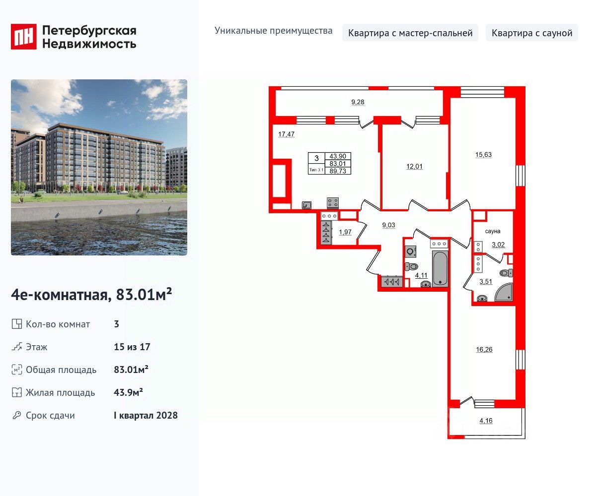 Уникальная, функциональная европланировка, большая кухня-гостиная 17.47 м², вместительная прихожая 9.03 м². Общая площадь квартиры - 83.01 м², жилая 43.9 м², высота потолка 2.77 м.