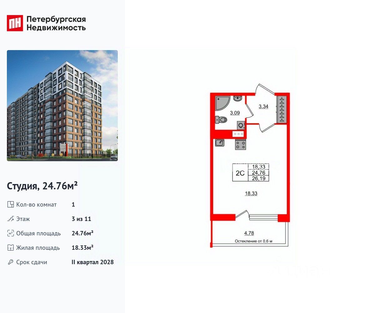 Удобная, классическая, функциональная европланировка, просторная прихожая 3.34 м². Общая площадь студии - 24.76 м², жилая 18.33 м², высота потолка 2.77 м.