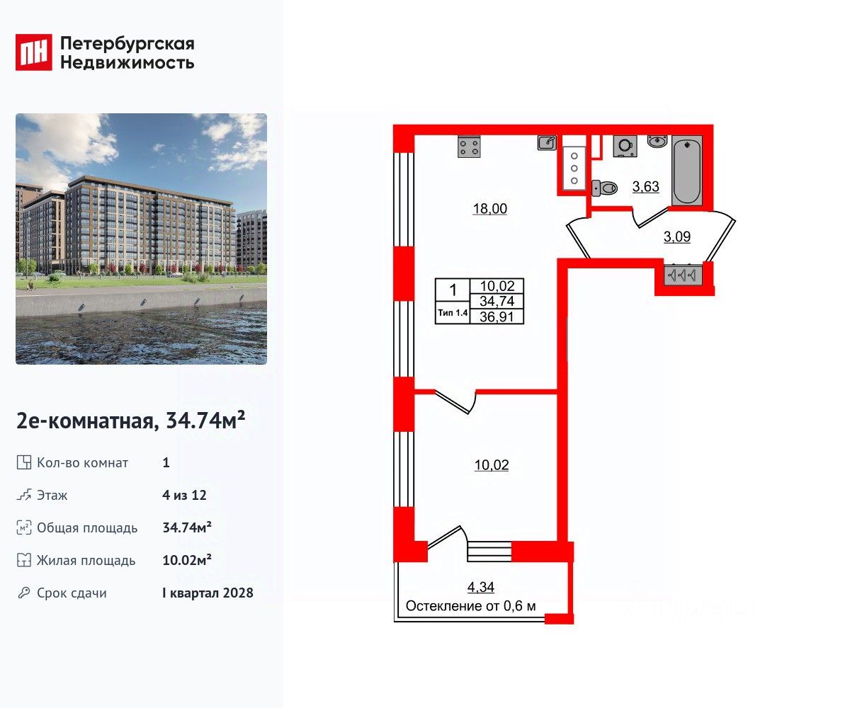 Удобная, классическая, функциональная европланировка, большая кухня-гостиная 18 м², вместительная прихожая 3.09 м². Общая площадь квартиры - 34.74 м², жилая 10.02 м², высота потолка 2.77 м.