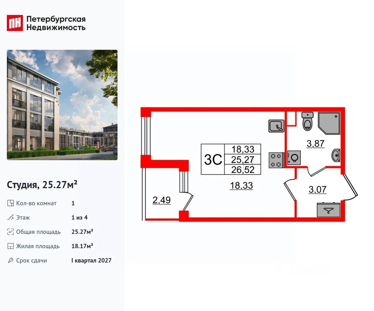 Удобная, классическая, функциональная европланировка, вместительная прихожая 3.15 м². Общая площадь студии - 25.27 м², жилая 18.17 м², высота потолка 2.75 м.